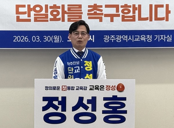 전남광주 통합특별시 교육감 선거에 출마한 정성홍 예비후보가 장관호 예비후보 측에 후보 단일화를 공식 제안했습니다.