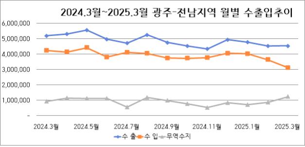 광주본부세관이 집계한 광주·전남 3월 수출은 45억4천700만 달러로 전년 같은달보다 12.6%, 수입은 31억3천900만 달러로 21.3%가 각각 감소했습니다.