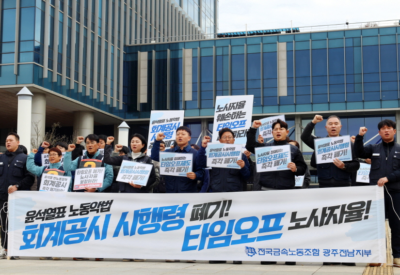 전국금속노조 광주전남지부는 오늘(12일) 광주지방고용노동청 앞에서 기자회견을 열고 윤석열 정부의 노조 탄압 정책인 회계 공시 제도의 폐기를 촉구했습니다.