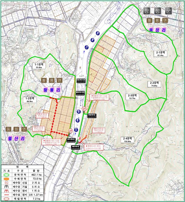 군은 황룡면 옥정리‧황룡리 일대 배수펌프장 2곳과 배수문 1곳을 설치하고, 배수로 1.37km를 확장할 계획입니다.