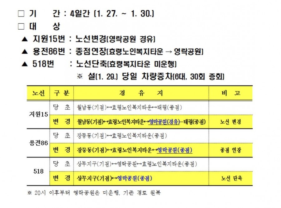 또 월남동에서 태령을 운행하는 지원15번은 영락공원을 경유하고 용전86번도 종점이 영락공원까지 연장됩니다.