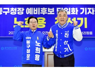 더불어민주당 광주 동구청장 선거에 출마하는 노희용·진선기 예비후보가 단일화하기로 결정했습니다. 두 후보는 오늘 ..