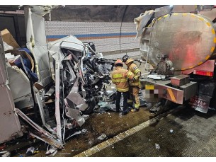 오늘 오전 9시 34분쯤 전남 구례군 순천완주고속도로 하행선 천마터널에서 2.5톤 화물트럭이 탱크로리를 들이받았습니다.이 ..