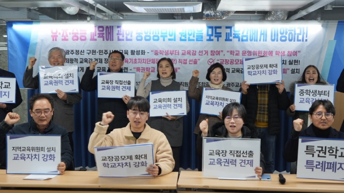 이들 단체는 "광주와 전남이 통합하면 교육감의 권한이 더욱 커져 전남 22개 시·군 교육장과 광주 2개 교육장을 모두 임명하게 된다"며 "지역교육장은 교육에서 기초자치단체장과 마찬가지인 만큼 교육자치를 위한 교육장 직선제를 도입해야 한다"고 강조했습니다.