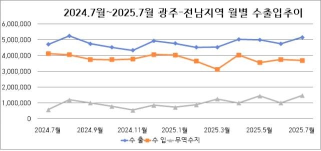 목록 7월 광주·전남 무역수지 14억6천만 달러 흑자 페이지 정보 작성자 진재훈기자 댓글 0건 조회 336회 작성일 25.08.18 본문 7월 광주·전남 지역 수출이 늘면서 무역수지가 14억6천800만 달러 흑자를 기록했습니다. 광주 수출은 16억1천만 달러, 전남은 35억6천만 달러였고, 수입은 각각 6억9천200만 달러와 30억1천만 달러로 집계됐습니다. 반도체·기계류·수송장비 수출이 증가했고, 원유·석유제품 등 수입은 줄었습니다. 올해 1∼7월 누계 무역수지는 79억7천만 달러 흑자를 기록했습니다. 이전글 정부, 광주시 AI 2단계 사업 의결…5년간 6천억 투입 25.08.18 목록 다음글 광주·전남, 김대중 대통령 서거 16주기 추모 25.08.18