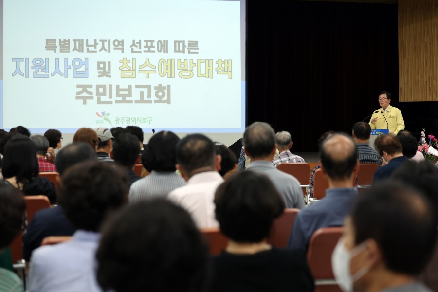 광주 북구는 오늘 특별재난지역 선포에 따른 지원사업 및 침수 예방대책 주민보고회에서 "우수저류시설 설치 등 추진 중인 10개 사업 외 풍수해 생활권 종합정비사업 등 12개 사업을 유관기관에 건의했다"고 밝혔습니다.