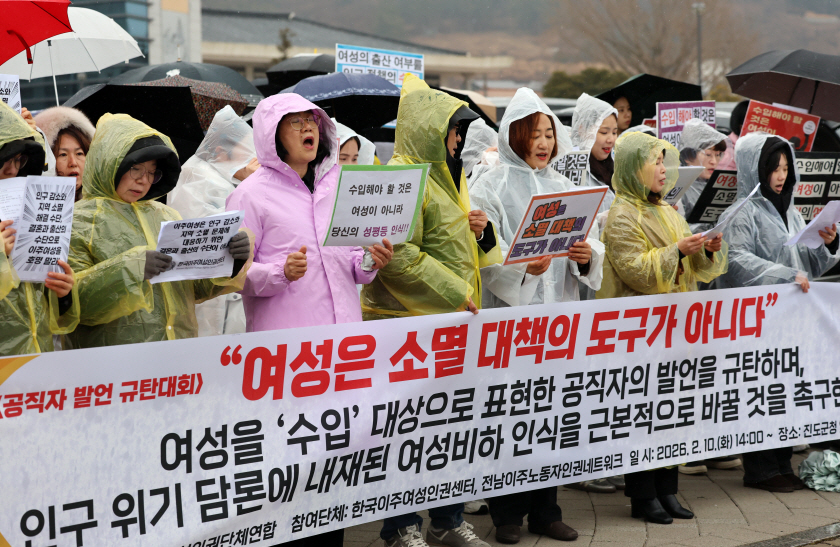 전남여성인권단체연합은 오늘(10일) 진도군청 앞에서 기자회견을 열고 "여성을 '수입' 대상으로 표현한 진도군수의 발언을 강하게 규탄한다"고 밝혔습니다.