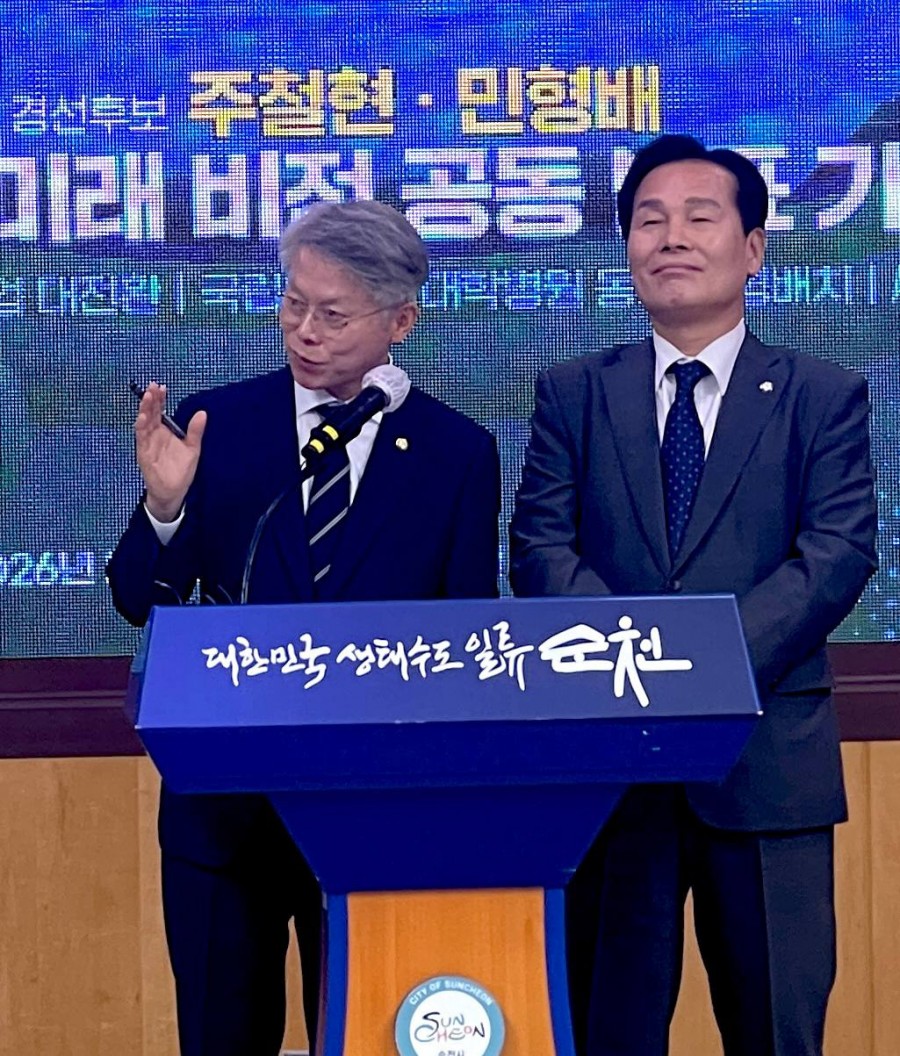 더불어민주당 전남광주특별시장 후보 경선에 나선 민형배·주철현 의원은 오늘 순천시청 소회의실에서 전남 동부권 미래 비전 공동 기자회견을 열고 산업· 국립의대·반도체를 핵심으로 하는 3대 현안 관련 공약과 정견을 발표했습니다.