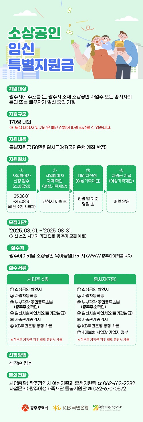 광주시가 임신 또는 출산한 소상공인 가정에 50만 원씩 특별지원금을 지급합니다.