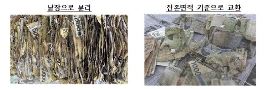 지폐는 남은 면적이 75% 이상이면 전액, 40% 이상이면 반액을 교환받을 수 있고, 여러 조각일 경우 문양과 번호가 확인되면 이어 붙인 면적 기준으로 판단합니다.