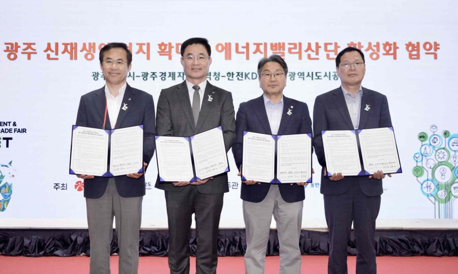광주시는 오늘 광주 김대중컨벤션센터에서 광주경제자유구역청, 한전KDN, 광주도시공사 등과 '신재생에너지 확대 및 에너지밸리산단 활성화'를 위한 업무협약을 체결했습니다.
