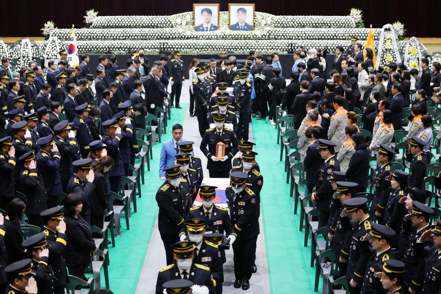 완도 수산물 냉동창고 화재 현장에서 진화 작업과 인명 구조에 투입됐다가 순직한 고(故) 박승원 소방경과 노태영 소방교의 영결식이 오늘 오전 완도군 농어민문화체육센터에서 엄수됐습니다.