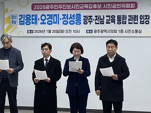 김용태 오경미 정성홍 후보는 오늘 광주시의회에서 기자회견을 열고 광주·전남 행정통합에는 공감하지만 준비 없는 졸속 교육통합에는 반대한다고 밝혔습니다.