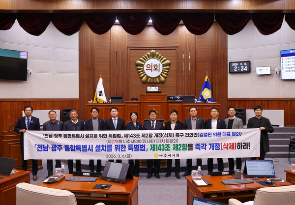 나주시의회가 '전남광주통합특별시 설치를 위한 특별법' 제143조 제2항의 삭제를 촉구하고 나섰습니다.