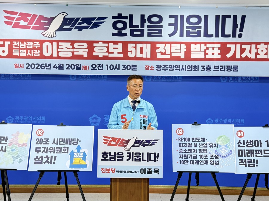 이종욱 진보당 전남광주특별시장 예비후보는 오늘 광주시의회 브리핑룸에서 기자회견을 열고 호남의 생존과 미래 번영을 위한 5대 전략을 발표했습니다.