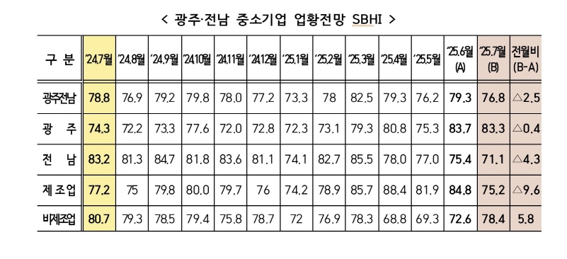중소기업중앙회 광주전남지역본부는 지역 중소기업 213개사를 대상으로 7월 경기전망조사를 실시한 결과 중소기업 업황전망지수(SBHI)가 76.8로 전월 대비 2.5포인트 하락했다고 밝혔습니다.