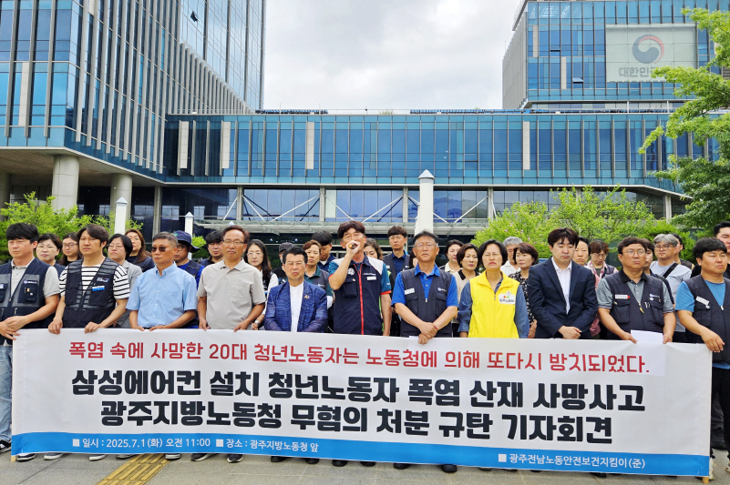 광주전남노동안전보건지킴이는 오늘(1일) 광주고용노동청 앞에서 기자회견을 열고 "폭염 속에서 사망한 20대 청년 노동자는 노동청에 의해 또다시 방치됐다"며 "제대로 된 수사 없이 회사에 면죄부를 준 노동청을 규탄한다”고 밝혔습니다.