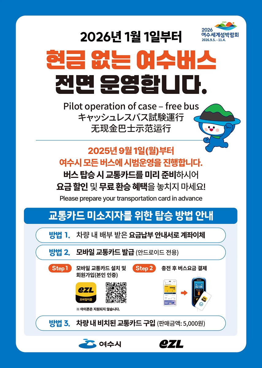 여수시는 내년 1월 1일부터 ‘현금 없는 시내버스’ 제도를 본격 시행한다고 밝혔습니다.
