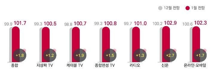 매체별로는 모든 매체에서 12월보다 광고비 집행이 증가할 것으로 예상됐지만 지난해 1월과 비교하면 지수는 99.4로 소폭 낮아졌습니다.
