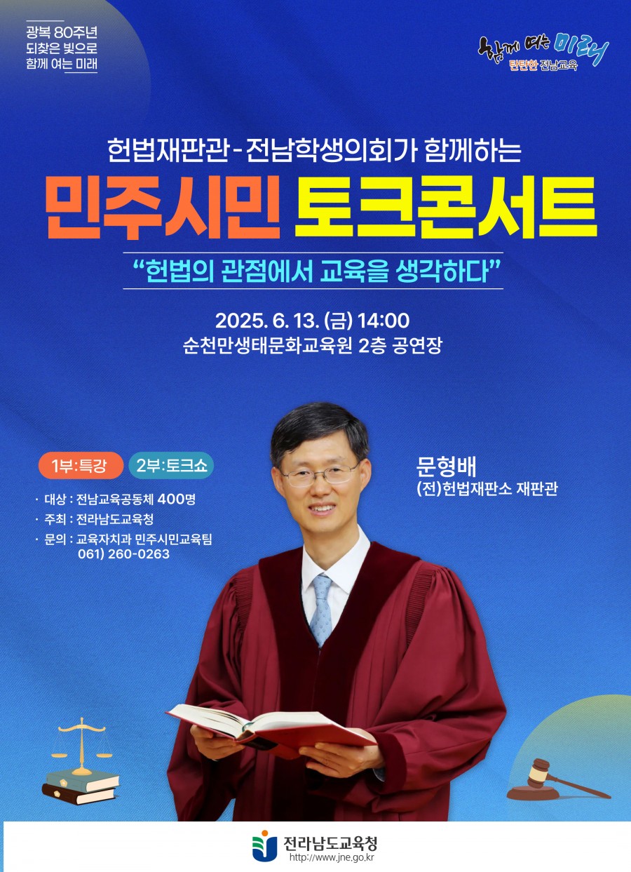 전라남도교육청이 오는 13일 순천만생태문화교육원에서 문형배 전 헌법재판소 재판관을 초청해 토크 콘서트를 개최합니다.