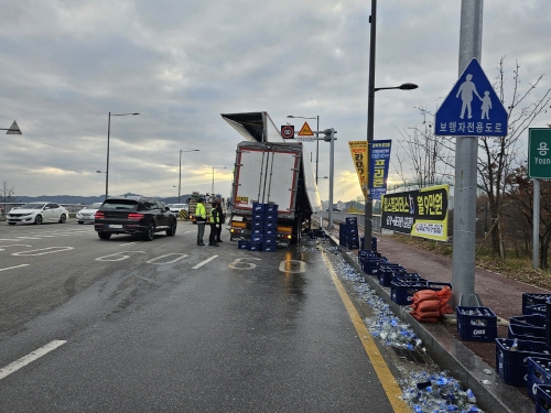 도로 달리던 25t 화물차서 맥주병 '와르르'