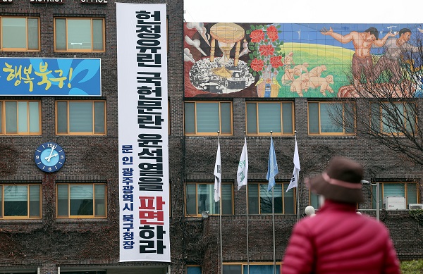 문인 광주 북구청장이 윤석열 대통령 파면을 촉구하며 청사 외벽에 내건 현수막의 강제철거가 논의중입니다.