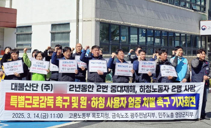 전국금속노조 광주전남지부는 오늘(14일) 고용노동부 목포지청에서 기자회견을 열고 "대불산단 내 선박제조업체에서 2년 사이 하청노동자 2명이 숨지는 사고가 발생했다"며 재발방지 대책과 마련과 노동당국의 특별근로감독을 촉구했습니다.