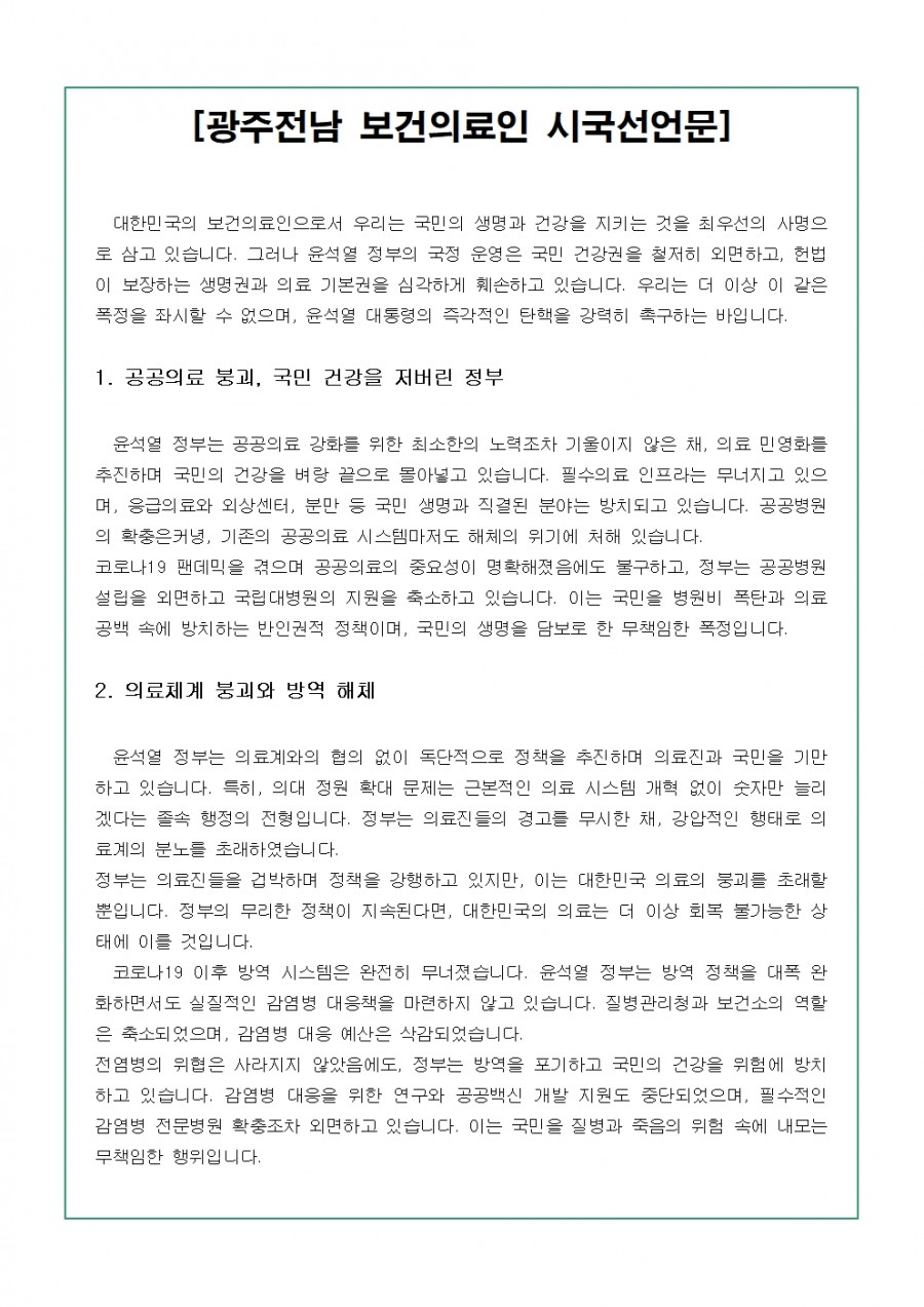 광주·전남 보건 의료인들이 시국 선언문을 발표하고 "윤석열 대통령을 즉각 파면해야 한다"고 밝혔습니다.