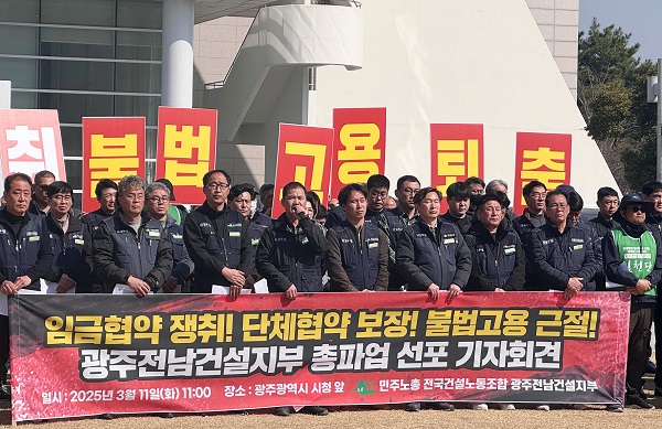 전국건설노동조합 광주전남건설지부는 오늘 오전 광주시청 앞에서 기자회견을 열고 오는 21일부터 파업에 돌입한다고 밝혔습니다.