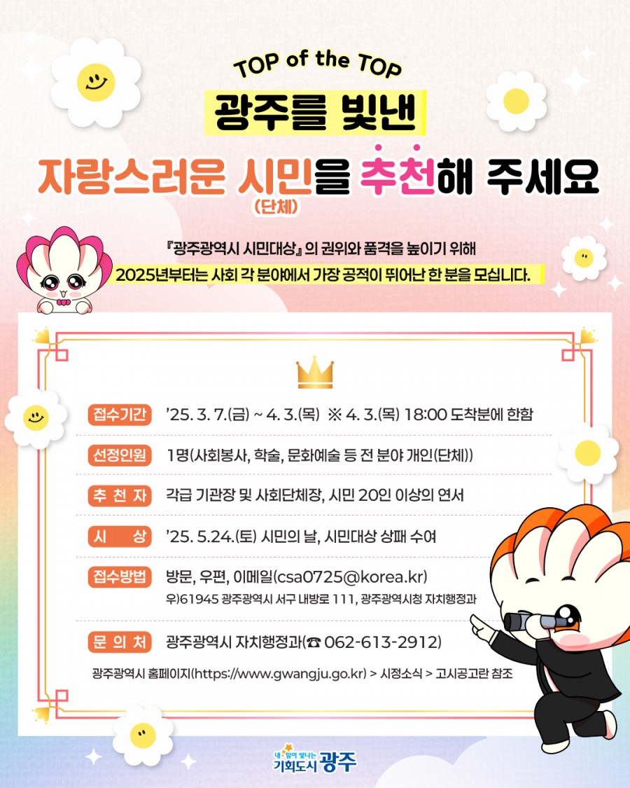 광주시가 '제38회 시민대상' 후보자를 공개 모집합니다.
