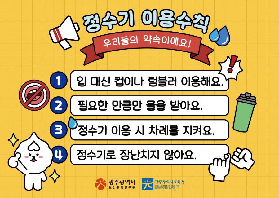 광주시보건환경연구원은 광주시교육청과 함께 3월 새학기를 맞아 유치원생과 초등학생들이 안전하게 정수기를 이용할 수 있도록 정수기 이용수칙애니메이션을 제작했습니다.