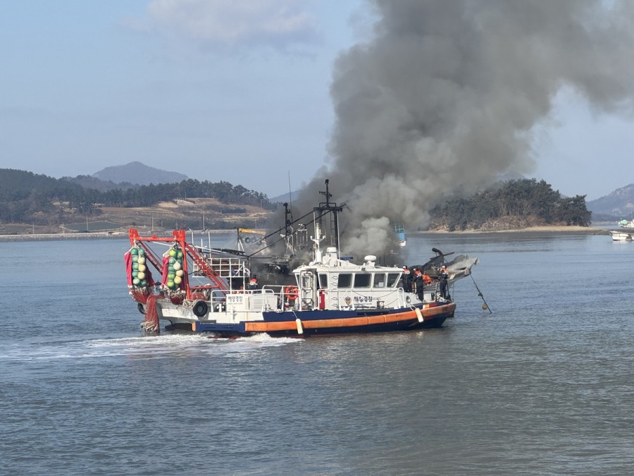 오늘(25일) 오전 9시 37분 쯤 전남 신안군 송도항 인근 해상에 정박 중이던 9.7t 어선에서 불이 났습니다.
