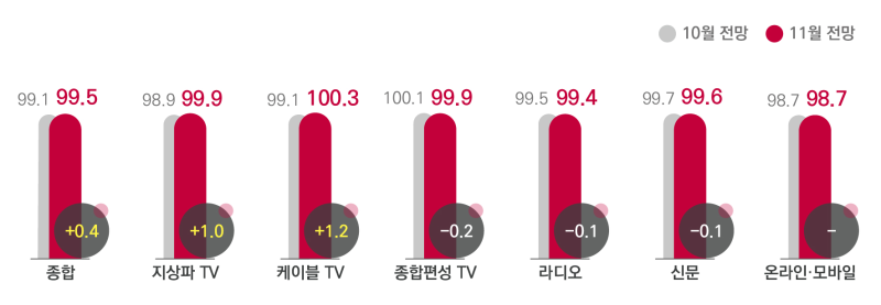 코바코가 발표한 11월 광고경기전망지수는 99.5로, 두 달 연속 기준선인 100을 밑돌았습니다.