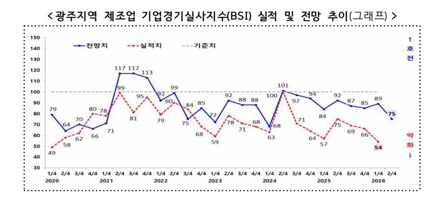 광주상공회의소가 지역 107개 제조업체를 대상으로 기업경기실사지수(BSI)를 조사한 결과 올해 2분기 기업경기실사지수는 75로, 전 분기 89보다 14포인트나 하락했습니다.