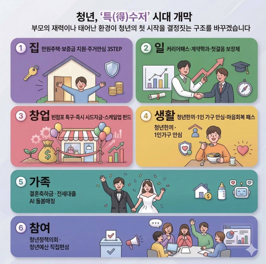 또 권역별 산업 연계 '청년 커리어패스', 계약학과 확대, 청년 한 끼 제휴, 1인 가구 안심제 등을 통해 취업과 생활 지원을 강화하고, 청년예산제·청년정책의회 상설화 등으로 '청년 결정 정부'를 구현하겠다는 구상도 제시했습니다.