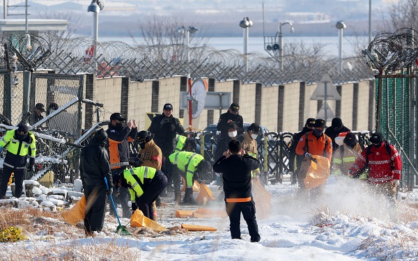 관계자들은 활주로 담장 바깥에 흩어진 기체 잔해를 수색하면서 사고 현장에서 발견된 기체 부품을 정리했습니다.
