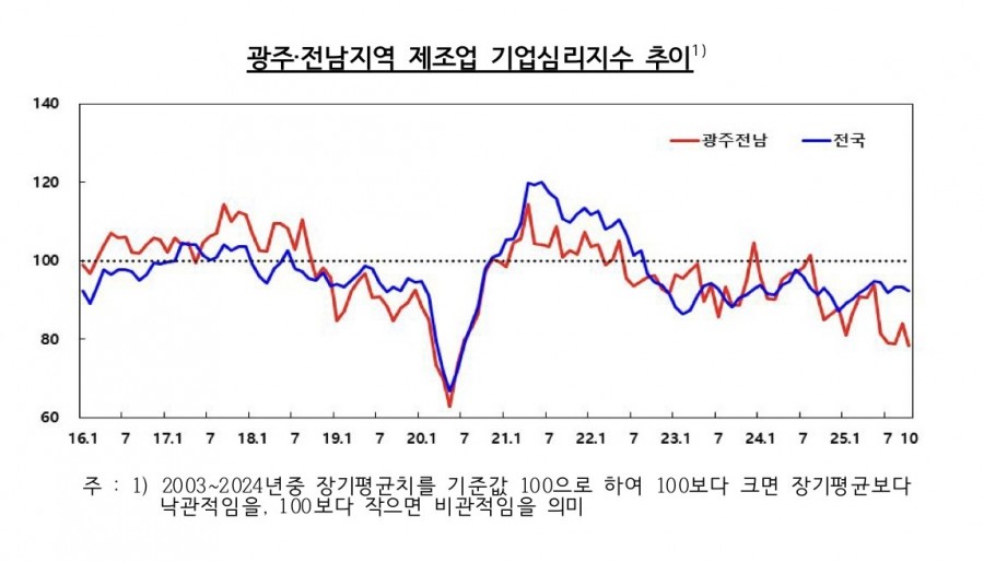 한국은행 광주전남본부가 지역 소재 529개 기업을 대상으로 10월 체감 경기를 조사한 결과 제조업 기업심리지수(CBSI)는 78.4로 전월보다 5.5포인트 하락했습니다.