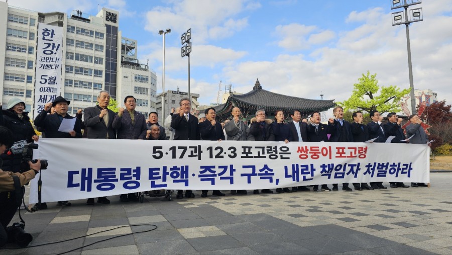 이보다 앞선 오후 2시 전일빌딩에서는 민주화운동 원로들이 모여 시국선언을 통해 "탄핵안 표결에 불참한 국민의힘은 내란 동조 반국가정당임을 스스로 드러냈다"며 "민주공화국의 정당으로서 최소한의 자격도 갖추지 못한 '내란 정당' 국민의힘을 해산시켜야 한다"고 촉구했습니다.