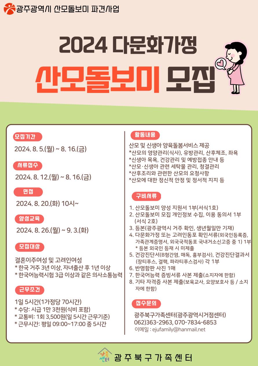 다문화가정 산모돌보미 사업 지원 대상은 광주시에 거주하는 등록 결혼이주여성과 고려인 산모로, 70시간까지 무료로 이용할 수 있습니다.