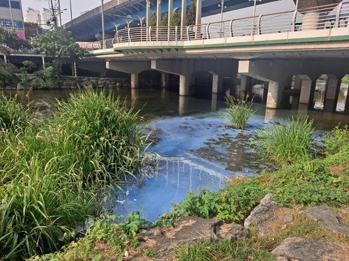 오늘(12일) 오전 10시 쯤 동구 남광주시장 남광교 인근 아파트 도색공사에 쓰인 푸른색 페인트가 광주천으로 흘러들어왔습니다.