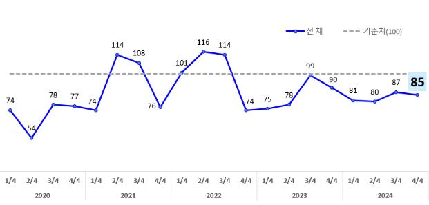 소매유통업 경기전망지수는 2022년 3분기 114를 마지막으로 기준치 100을 9분기 연속 밑돌고 있습니다.