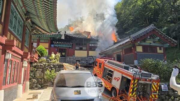 이 불은 공양소에서 용접 작업을 하던 중 불꽃이 샌드위치 패널로 튀면서 발생한 것으로 다행히 인명이나 성보문화재 훼손 등의 피해는 없는 것으로 확인됐습니다.