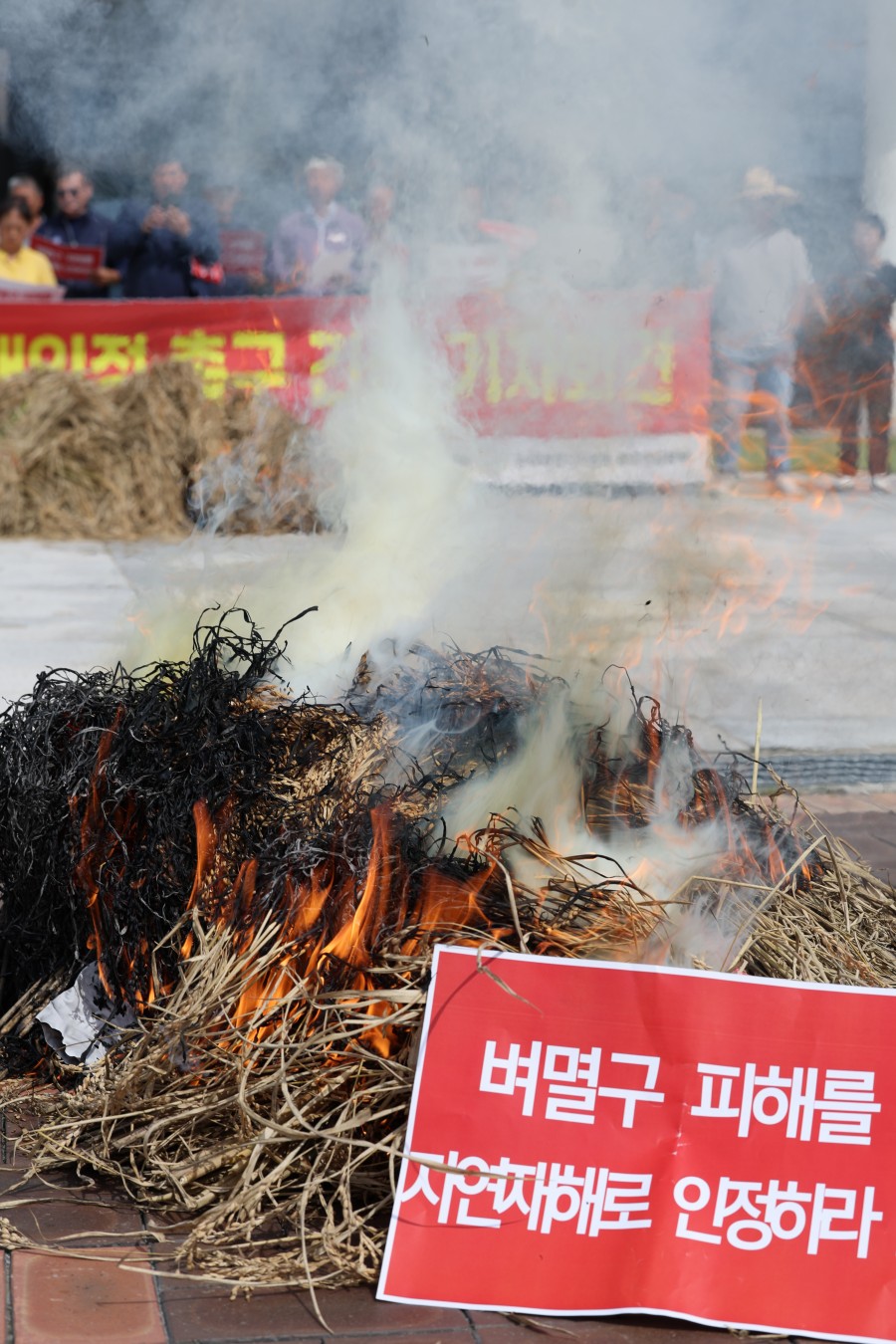 전남지역 농민들이 병충해로 말라버린 벼를 태우며 정부에 벼멸구 피해를 자연재해로 인정하라고 촉구했습니다.