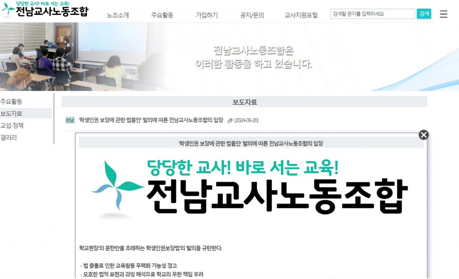 전남교사노동조합 지난 13일 더불어민주당 김문수 의원 등에 의해 재발의 된 ’학생인권 보장에 관한 법률안’ 을 비판하고 철회를 요구했습니다.