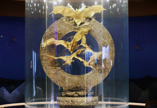 황금박쥐상은 가로 1.5m, 높이 2.1m 규모 은으로 된 원형 조형물과 오로지 순금으로 만든 6마리의 황금박쥐가 날개를 펼치고 날아오르는 모습을 형상화한 조형물입니다. (사진= 연합뉴스)