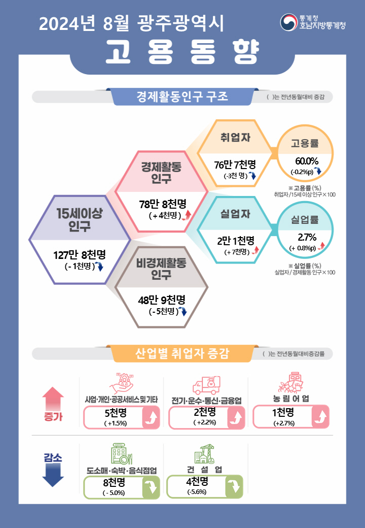 호남지방통계청이 발표한 8월 고용 동향 자료를 보면 광주의 고용률은 60.0%로 올들어 가장 낮았고, 1년 전보다도 0.2%포인트 하락했습니다.