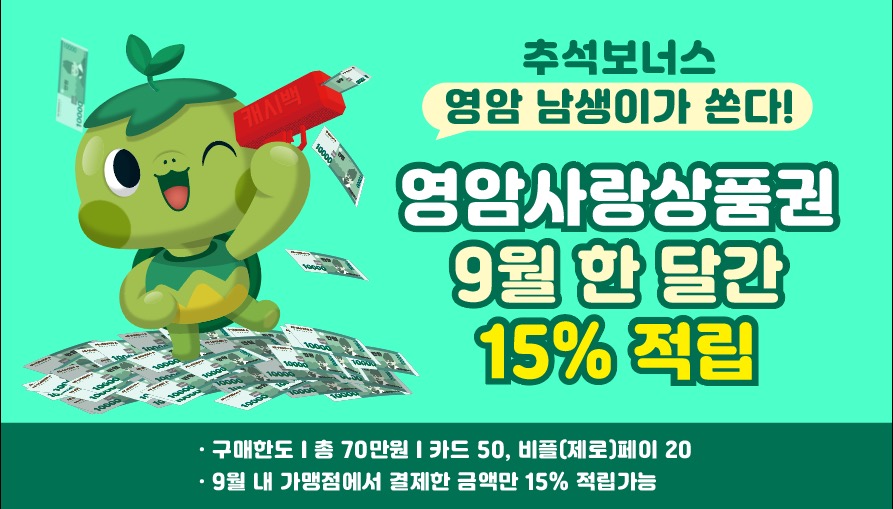전남 영암군이 9월 한 달 동안 추석 맞이 영암사랑상품권 15% 적립 이벤트를 실시합니다.