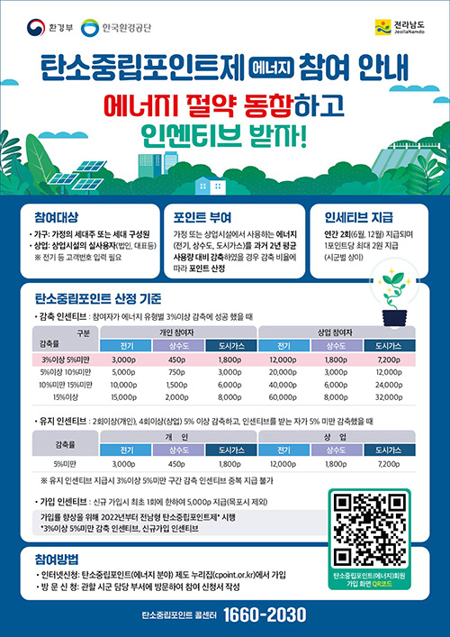 전남도는 그동안 가입자가 에너지 사용량을 5% 이상 감축했을 때만 인센티브를 지급했지만, 2022년부터는 3% 이상 5% 미만을 감축한 가구에도 인센티브를 확대 지급하는 전남형 탄소중립포인트제를 시행하고 있습니다.