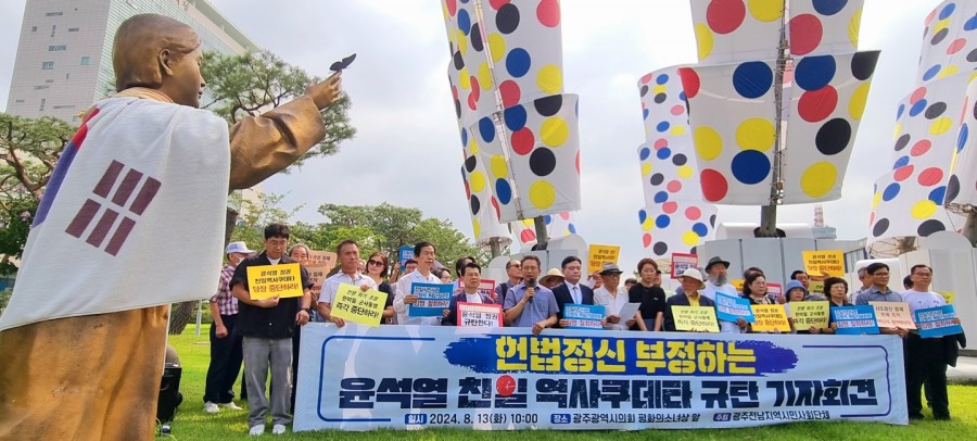 단체는 오늘 오전 광주시의회 평화의 소녀상 앞에서 기자회견을 열어 "선열들의 정신을 기리는 독립기념관 관장이 친일반민족행위자를 옹호한 것은 역사상 있을 수 없는 일이다"며 "고귀한 항일 독립투쟁의 정신을 조롱한 것이다"고 비판했습니다.