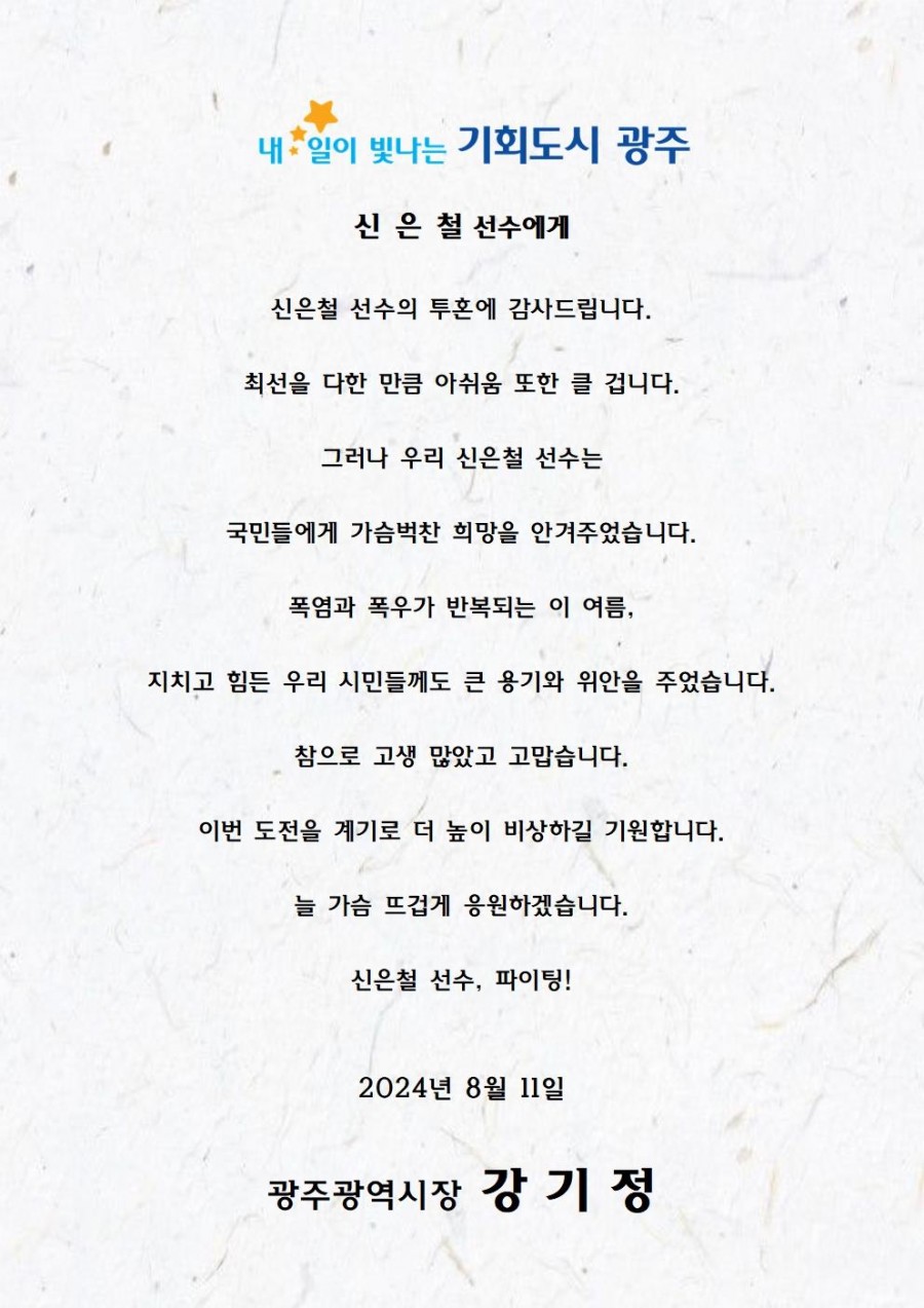 강기정 광주시장은 오늘 파리올림픽에서 열전을 펼친 광주시 소속 선수단에게 격려 메시지를 전달했습니다.